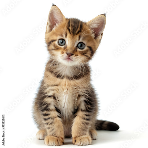 Obraz premium An adorable tabby kitten with captivating blue eyes sits attentively on a white background. Perfect for pet-related content, advertising, or websites