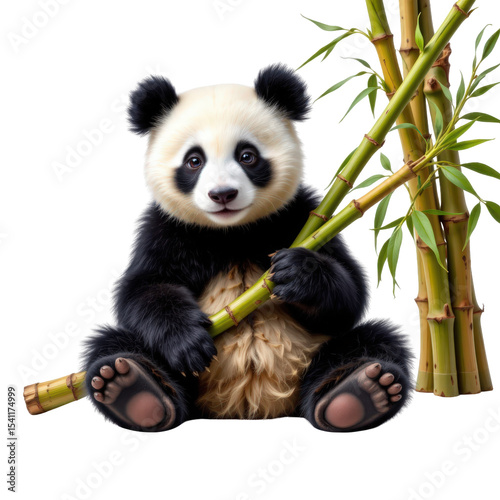 © Athiphat, Naklejka premium An adorable young panda sits contentedly among bamboo stalks, holding a leafy branch in its paws, isolated background.