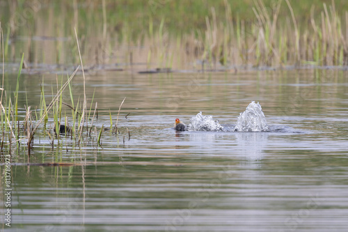 Fototapeta premium An adult Coot (Fulica atra) with chick. Adult dives and splashes nearby chick. Natural reedbed habitat. UK