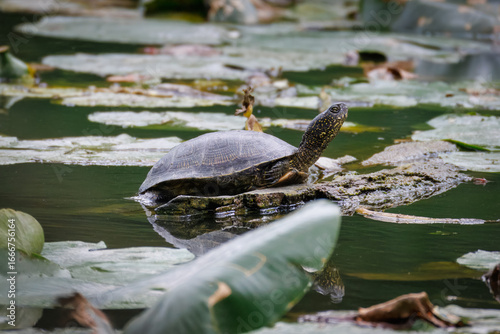 © Mariia, Fototapeta premium An adult European pond turtle lies on a wooden log, basking on a summer day, perpendicular to the camera lens, with green water leaves in the background.