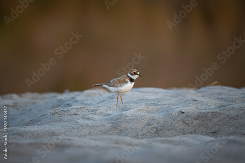 © Mariia, Fototapeta premium An adult Little Ringed Plover stands on the sandy riverbank, perpendicular to the camera lens, with a brown ground background on a summer sunset.