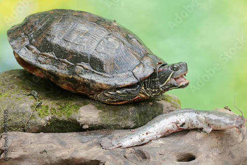 © I Wayan Sumatika, Fototapeta premium An adult red-eared slider tortoise preys on a catfish on the riverbank. This reptile has the scientific name Trachemys scripta elegans.