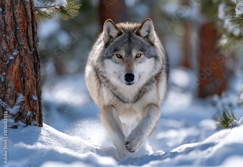Naklejka premium an adult wolf running in the snow, with a forest background on a sunny winter...