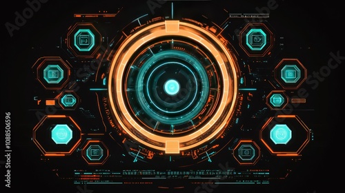 Fototapeta premium An advanced heads-up display with a bold neon-orange and aqua color scheme, centered around a complex circular formation. Concentric rings, hexagonal grids, and angular lines radiate from the core.