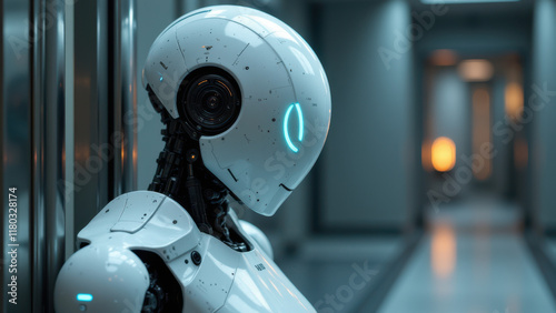 © Tameem, Fototapeta premium An advanced humanoid robot stands near an elevator in a sleek building hallway.