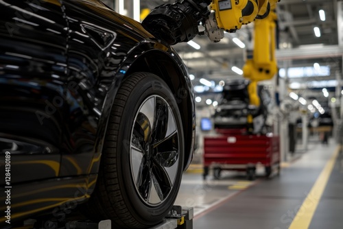 © Milos, Fototapeta premium An advanced robotic arm is engaged in assembling a sleek automobile in a modern factory, symbolizing innovation and efficiency in the automotive industry.