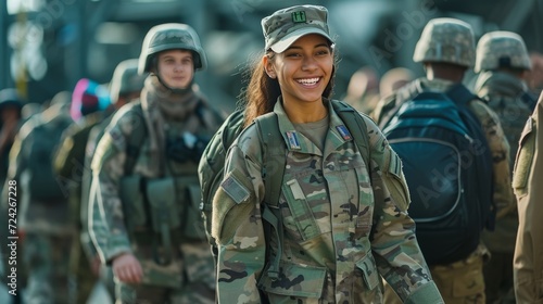 Fototapeta premium an advertisement photograph of a military walking on base, everyone is smiling