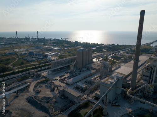 Obraz premium An aerial above a harborfront coal mining and processing facility, seen in the early morning.