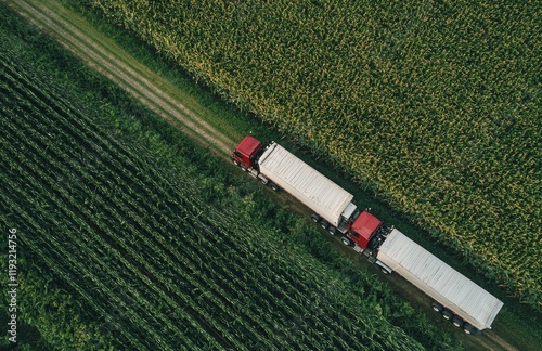 © Danila, Obraz premium An aerial shot captures corn harvest in the fields, featuring a transporter and a harvester