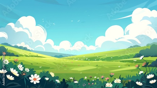 Fototapeta premium An aerial view of a beautiful blue sky with fluffy clouds over a green field...