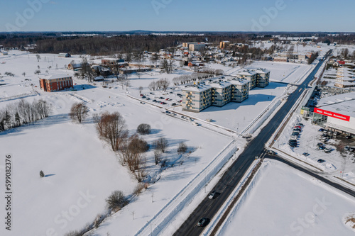 © Raivo, Obraz premium An aerial view of a city during winter, surrounded by built structures and skiing pistes covered in snow from the high angle viewpoint
