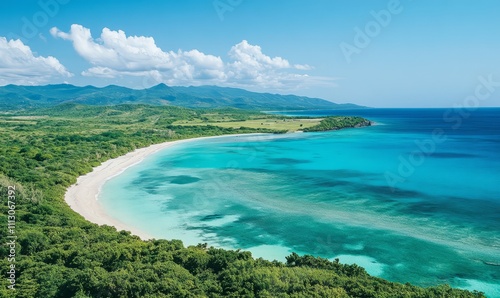 Fototapeta premium An aerial view of a pristine tropical beach with turquoise waters and lush...