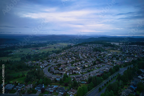 © Derrick, Obraz premium An aerial view of a residential community in a valley surrounded by forests of evergreen trees taken during sunrise.
