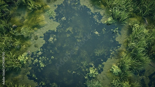 © Anna, Fototapeta premium an aerial view of a swampy area with water and green plants in the foreground and a bird's eye view of the area in the middle of the photo.