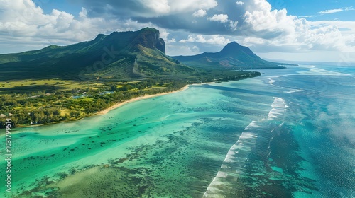 Fototapeta premium An aerial view of a tropical island with mountains, a coastline, and...