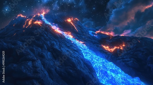 Naklejka premium An aerial view of blue lava cascading down a volcanic slope under starry skies