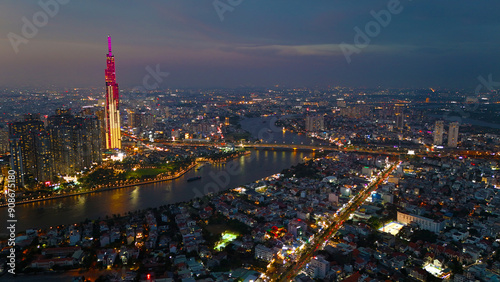 Fototapeta premium An aerial view of Ho Chi Minh City at sunset, vibrant colorful s