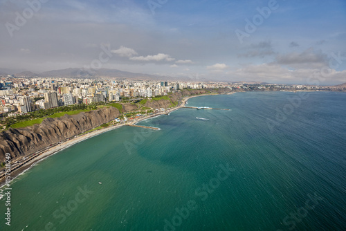 Fototapeta premium An aerial view of Lima’s Costa Verde reveals the perfect blend of urban life and natural beauty.With cliffs that kiss the Pacific and waves that call to surfers, this coastline is pure magic.