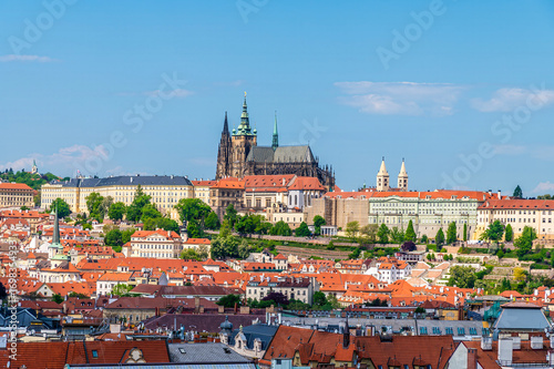 © Nicola, Obraz premium An aerial view of the castle complex on the west bank of the Vltava river from the City Hall tower in the old town square in central Prague in springtime