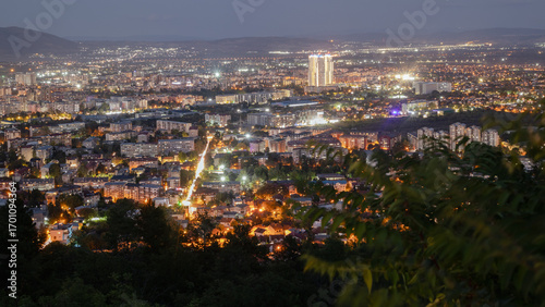 © Laurentiu Bratu, Naklejka premium an aerial view of the city of skopje at night, showing the urban landscape with illuminated buildings and streets under a twilight sky. the city lights create a vibrant and warm glow