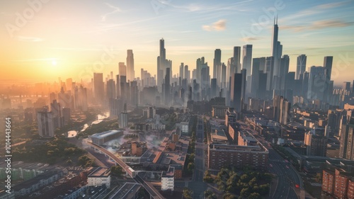 © Rezhwan, Obraz premium An aerial view of the skyscrapers in the heart of the business district as the sun sets behind them in Shenzhen, China.