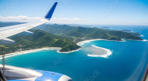 © Magic, Naklejka premium An aerial view of the turquoise Mediterranean coastline from an airplane window