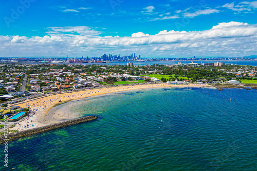 © south west images, Fototapeta premium An Aerial view of Williamstown Beach with the Melbourne Skyline in the background on a Sunny Summers Day