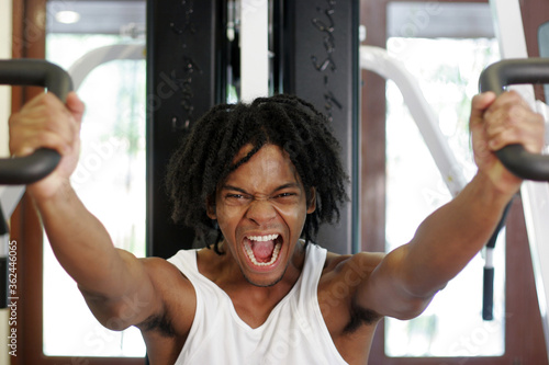 Fototapeta premium An African American man pulling with all his might during a power lifting training