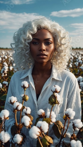 © Nemanja, Fototapeta premium An African American woman stands in a field of cotton flowers