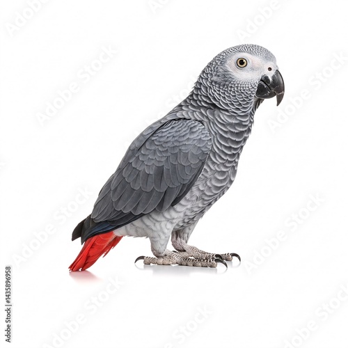 © Viktoriia, Naklejka premium An African grey parrot isolated on a white background. A grey bird with a bright red tail