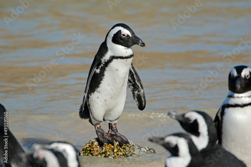 Naklejka premium An African penguin (Spheniscus demersus) standing on coastal rocks, Western Cape, South Africa.