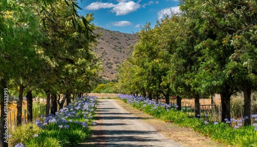 © Adrian, Fototapeta premium An agapanthus (Agaphanthus africanus) and tree lined avenue.