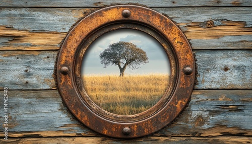 Fototapeta premium An aged, rusty porthole window with a view of a solitary tree in a meadow, set against a background of weathered wood grain and natural knots