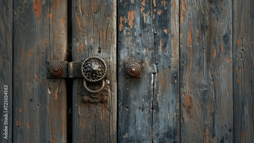 Fototapeta premium an aged wooden door, focusing on the rustic beauty of its textured surface and the character imbued by the vintage metal handle in a compelling close-up shot.