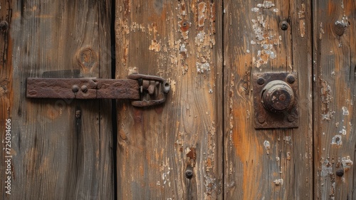 Fototapeta premium an aged wooden door, focusing on the rustic beauty of its textured surface and the character imbued by the vintage metal handle in a compelling close-up shot.
