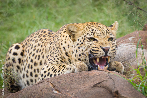 Fototapeta premium An aggressive male leopard snarling and crouching behind a big rock in Kruger...