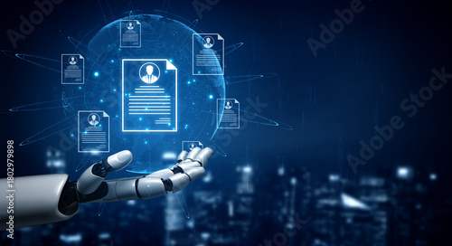 © InfiniteFlow, Obraz premium An AI assistant automates the global recruitment process by scanning candidate resumes. This smart human resources system selects the best profiles for the company's workforce. Fermion