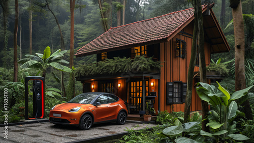© NajmiArif, Fototapeta premium An Ai generative image of old wooden house with electirc car and EV charging station insight