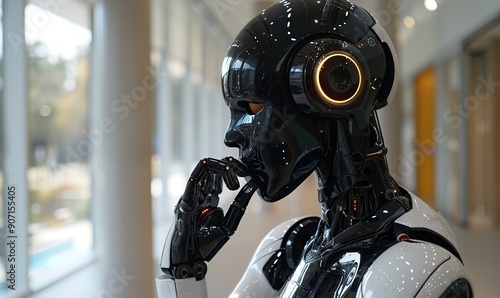 © Igal, Fototapeta premium An AI mannequin robot displays a thoughtful expression, showcasing advanced technology and artificial intelligence concepts.