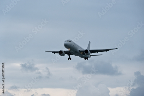 Fototapeta premium An airplane flies through clouds, observed from the runway.