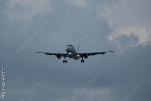 Fototapeta premium An airplane flies through clouds, observed from the runway.
