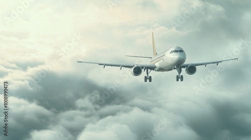 © elimicel, Obraz premium An airplane flying through a cloudy sky, symbolizing travel and adventure.