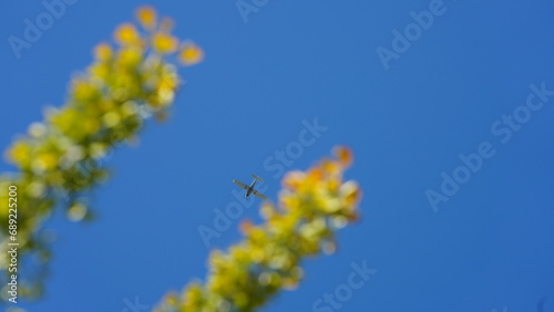 © Bo, Obraz premium An airplane flying through the clear blue sky in the sunny day