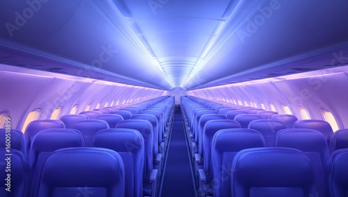 Fototapeta premium An airplane's cabin interior boasts blue seats that are neatly arranged, reflecting a modern design aesthetic that prioritizes comfort and functionality, with ample overhead storage, ideal for