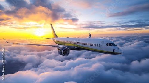 © Hanna, Fototapeta premium An airplane soars through a colorful sunset sky, surrounded by fluffy clouds.