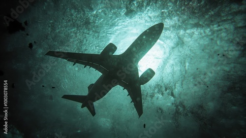 © BerkahStock, Fototapeta premium An airplane viewed from below, submerged in water, creating a surreal underwater scene.