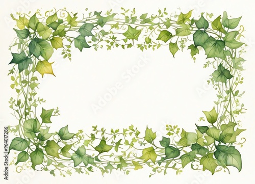 Fototapeta premium An airy watercolor illustration of a rectangular frame made of delicate green ivy leaves and vines