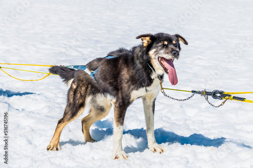 © Nicola, Naklejka premium An Alaskan Husky waiting for a run on the Denver glacier close to Skagway, Alaska in summertime