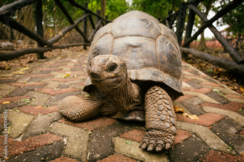 © danmir12, Naklejka premium An Aldabra giant tortoise looks out from its shell on Prison Isl