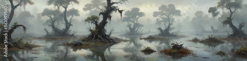 © 4K_Heaven, Fototapeta premium An alien wetland with fog-covered waters and peculiar, vine-like creatures hanging from the trees, depicted in thick, textured oil paint to enhance the eerie and mysterious landscape, Generative AI